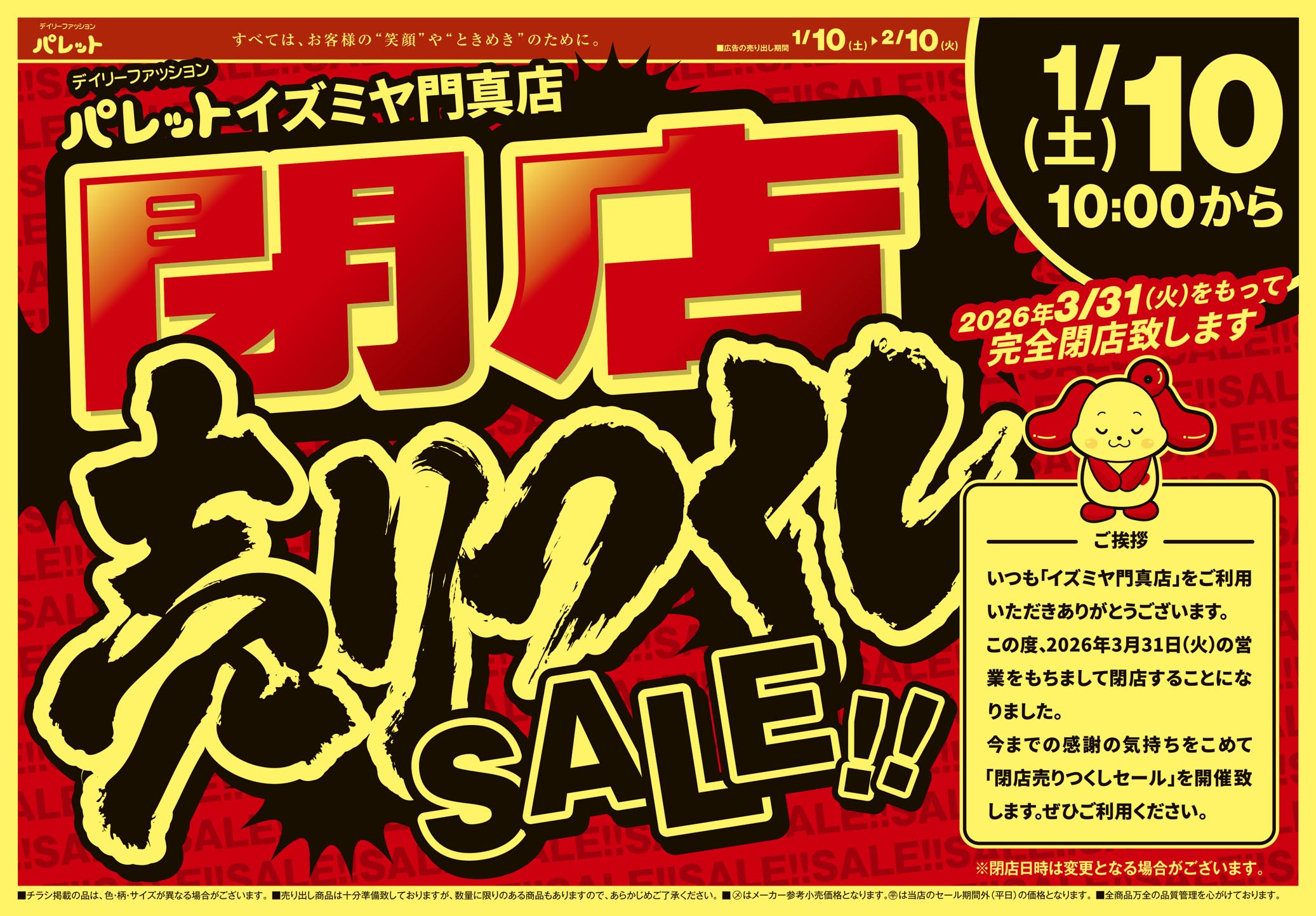 このたびパレット イズミヤ門真店は、2026年3月31日(火)をもちまして閉店させていただくこととなりました。感謝の気持ちを込めて閉店セールを開催いたます!!