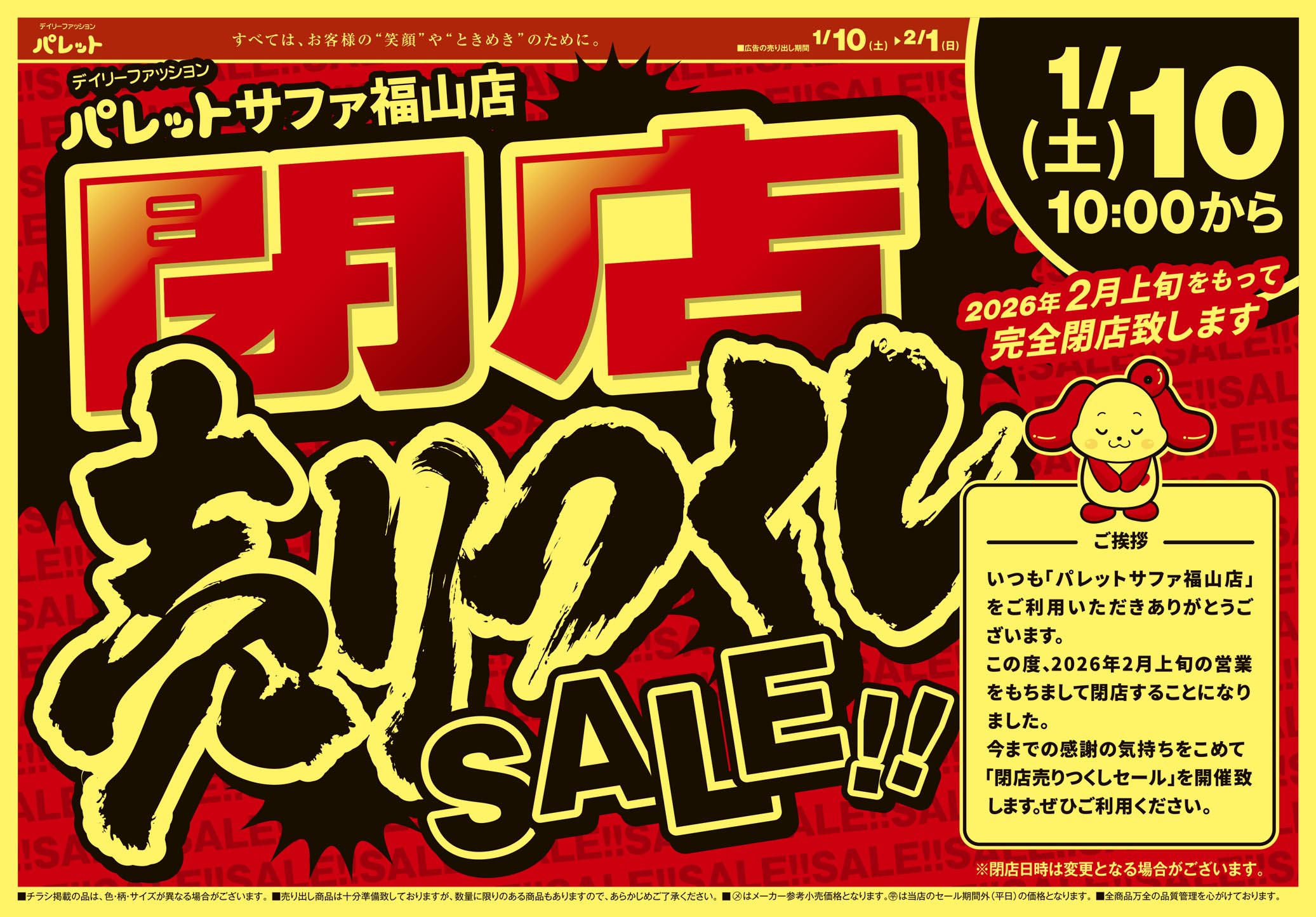 このたびパレット サファ福山店は、2026年2月上旬をもちまして閉店させていただくこととなりました。感謝の気持ちを込めて閉店セールを開催いたます!!
